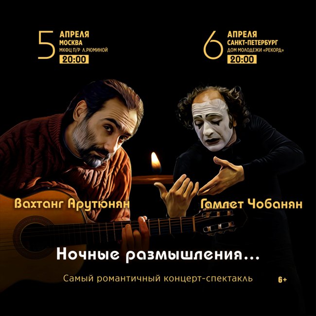 5 апреля в Москве и 6 апреля в Санкт-Петербурге состоятся незабываемые весенние вечера под звуки гитары, где зритель сможет окунуться в теплую, уютную, дружескую и эмоционально насыщенную атмосферу авторской песни и пантомимы. Самый романтичный концерт-спектакль "Ночные размышления..." представят два прекрасных артиста из Армении.