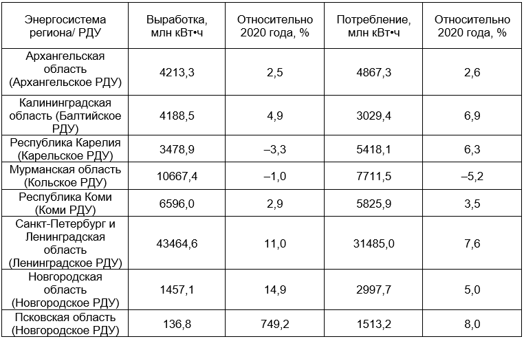 Суммарные объемы потребления и выработки электроэнергии в ОЭС Северо-Запада складываются из показателей энергосистем Мурманской, Новгородской, Псковской, Архангельской и Калининградской областей, энергосистемы Санкт-Петербурга и Ленинградской области, а также энергосистем Республики Карелия и Республики Коми.
