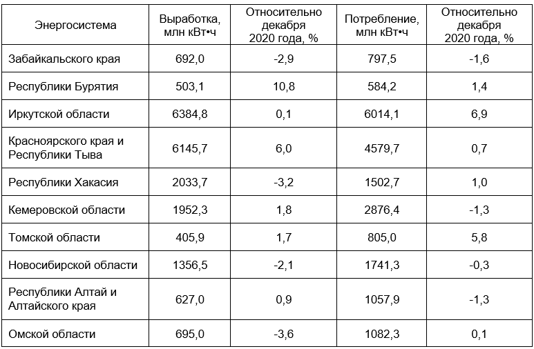 В декабре 2021 года электростанции ОЭС Сибири выработали 20 795,9 млн кВт•ч, что на 1,5 % больше показателя за тот же месяц 2020 года.
