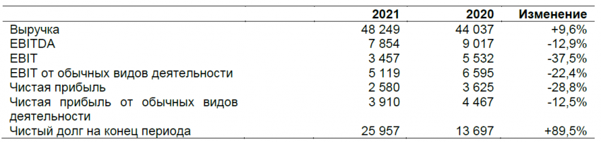 • Чистая прибыль от обычных видов деятельности показала лучшую динамику по сравнению с EBIT, снизившись на 12,5%. В основном это было обусловлено снижением чистых финансовых расходов на 78% благодаря благоприятной динамике курсов валют и укреплению рубля в течение 2021 года по сравнению с предыдущим годом, когда была зафиксирована отрицательная курсовая разница.