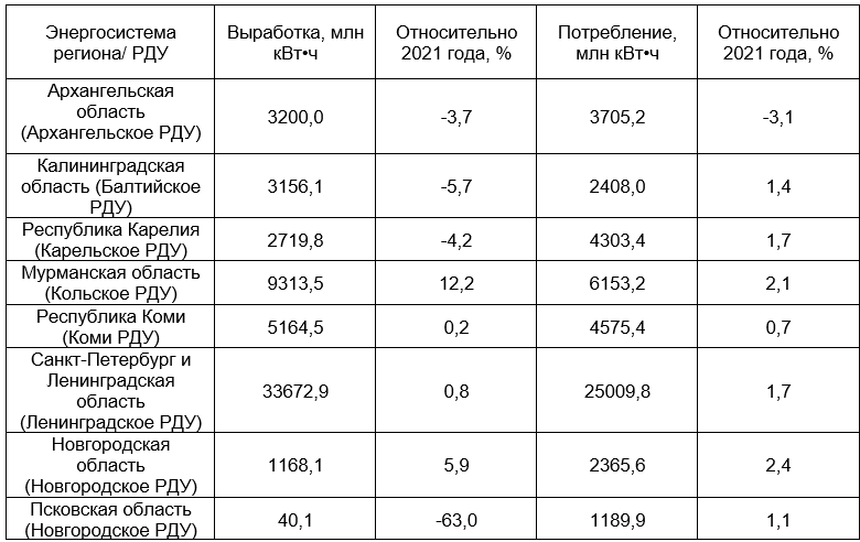 Потребление электроэнергии в ОЭС Северо-Запада за шесть месяцев 2022 года составило 49710,5 млн кВт•ч, что на 1,3 % больше, чем за такой же период 2021 года.