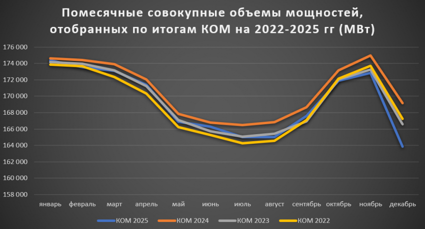 Из материалов КОМ следует, что по отношению к отбору на 2024 год объем отобранных мощностей в среднем по месяцу снизился на 1 432 МВт и составил 169 312 МВт (в 2024 году — 170 743,83 МВт). Наибольше сокращение этих объемов наблюдается во второй половине 2025 года.