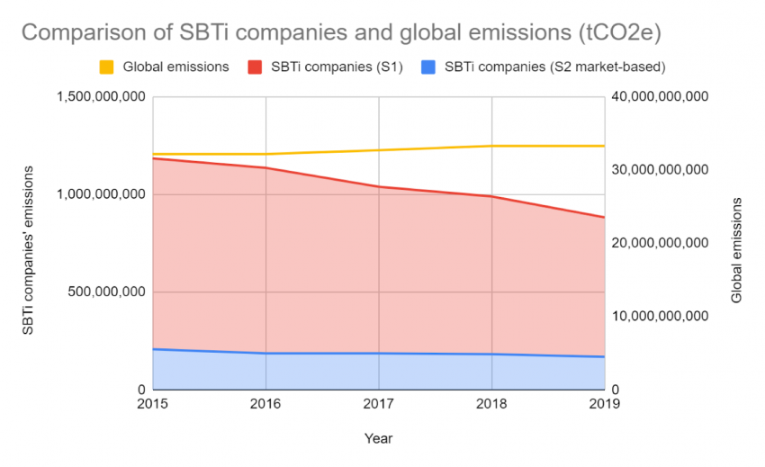 Инициатива SBTi считает, что в среднем компании SBT фактически сокращали прямые выбросы (объем 1 и 2) с линейной годовой скоростью (6,4%), превышающей скорость, необходимую в соответствии с критериями SBTi для соблюдения сценария ограничения глобального потепления на уровне 1,5 °C (4,2%). Это доказывает, что компании SBT предпринимают климатические действия в темпе, который не только соответствует, но и опережает темп действий, необходимый в соответствии с Парижским соглашением. Данные цифры сравниваются со средним увеличением глобальных выбросов от производственной деятельности энергетических и промышленных предприятий за тот же период примерно на 0,85% в год.