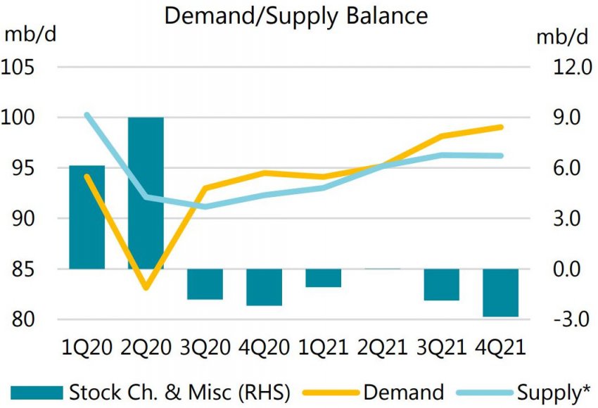 Отметив, что мировой рост спроса на нефть в декабре пошел вспять, агентство понизило свой прогноз на первый квартал на 580 000 баррелей в сутки и свой прогноз на 2021 год на 300 000 баррелей в сутки. Восстановление спроса в этом году, и усилия ведущих производителей, направленные на то чтобы сбалансировать рынок, сокращение добычи способствовало снижению запасов нефти и нефтепродуктов во всем мире. При этом агентство констатирует, что при всех предпринятых мерах, запасы нефти остаются близки к пиковым показателям мая прошлого года.