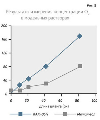 Из рис. 4 видно, что показания кислородомера пропорциональны изменениям длины силиконового шланга. Методика метиленового голубого реактива показала существенное занижение концентрации по сравнению с показаниями кислородомера.