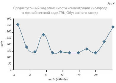 Поэтому практически, если концентрация кислорода, измеренная с применением метиленового голубого реактива, составляет 60–80 мкг/л, можно реально предполагать концентрацию в 2-3 раза большую. Таким образом, использование анализаторов при измерениях концентраций растворенного кислорода дает более достоверную информацию. На рис. 4 приведен характерный среднесуточный ход зависимости концентрации кислорода в прямой сетевой воде ТЭЦ Обуховского завода (ЦТП, ул. Запорожская, 23) в период отопительного сезона 2002/2003 года.