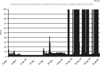 С начала отопительного сезона концентрация кислорода не превышала норм (30 мкг/л). С середины апреля 2003 года (рис. 6) наблюдается значительное их превышение. При уменьшении тепловой нагрузки недостаточная эффективность работы охладителей деаэрированной воды для поддержания требуемого температурного режима периодически заставляла подмешивать «сырую» воду.