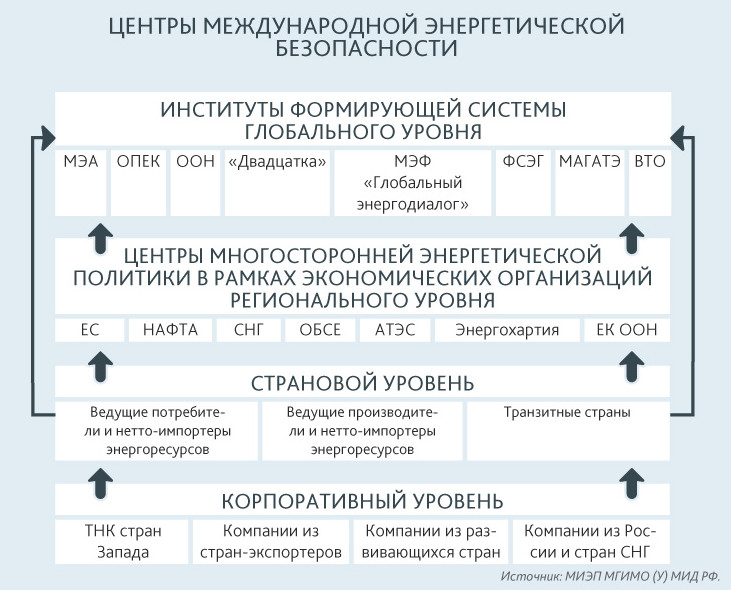 В рамках международных энергетических организаций глобального и регионального плана развивается многостороннее взаимодействие стран, являющихся нетто-импортерами, нетто-экспортерами или транзитными государствами, имеющими различные интересы. Кроме того, на деятельность этих международных организаций большое воздействие оказывают ведущие транснациональные корпорации. Интересы стран-импортеров заключаются в гарантированных долгосрочных и стабильных поставках энергетических ресурсов из внешних источников по разумно низким ценам.