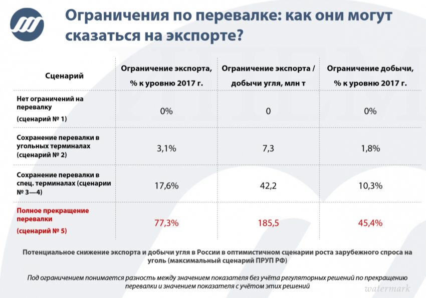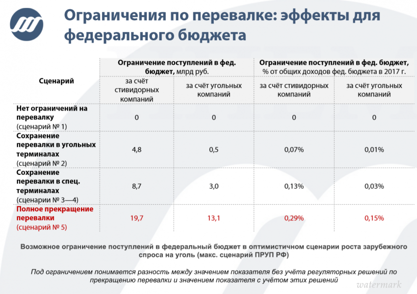 В рамках исследования ИПЕМ провел расчеты на основе 5 различных сценариев (разные условия динамики экспорта и ужесточения законодательного регулирования). И показали, что если темпы роста спроса на российский уголь сохранятся (на 29% к 2030 году относительно 2017-го), то любые ограничения на перевалку угля вызовут заметные негативные последствия для экономики России.