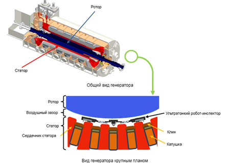 Новый ультратонкий робот-инспектор от Mitsubishi Electric рассчитан на движение в узком пространстве между ротором и статором генератора для точного технического контроля, включая оценку плотности посадки пазовых клиньев статора, подробный внешний осмотр и контроль изоляции сердечника.