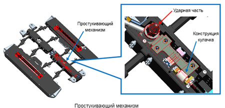 Робот оснащен простукивающим механизмом собственной разработки Mitsubishi Electric с компактным кулачком, способным создавать усилие удара в 10 раз сильнее обычного механизма. При контроле простукиванием используется оригинальная технология анализа вибраций для точного распознавания пяти уровней плотности посадки пазовых клиньев статора — обычные роботы различают лишь три уровня.