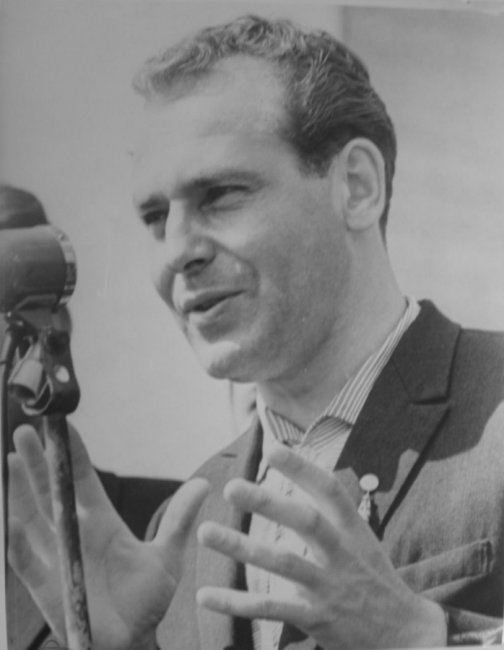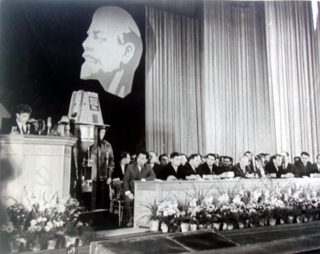 Космонавт Герман Титов выступает на торжественном митинге на шахте Пролетарская-Глубокая в Макеевке. Справа от супруги космонавта — В. Дегтярев