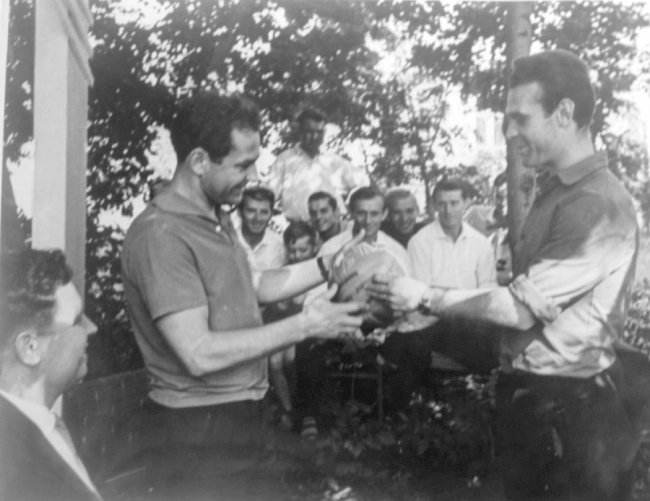 Но нам точно известно, что космонавт побывал в гостях у футболистов донецкого Шахтера. Команда тогда была «на коне» — двукратный обладатель Кубка СССР (1961 и 1962), и высокое место в текущем чемпионате страны (5-е место по итогам сезона 1964 года). Пообщался Титов с командой и главным тренеров Олегом Ошенковым, пожелал самых больших высот в спорте. По доброй традиции, футболисты подарили покорителю космоса мяч с автографами игроков команды.
