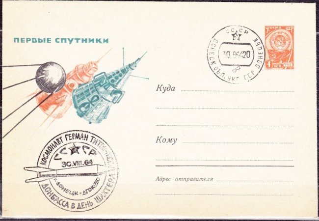 «Космонавт Герман Титов — гость Донбасса в день шахтера». Штемпель: черный, тираж: 250. Спецгашение по случаю приезда Германа Титова в Донбасс.