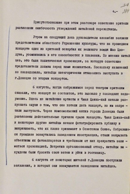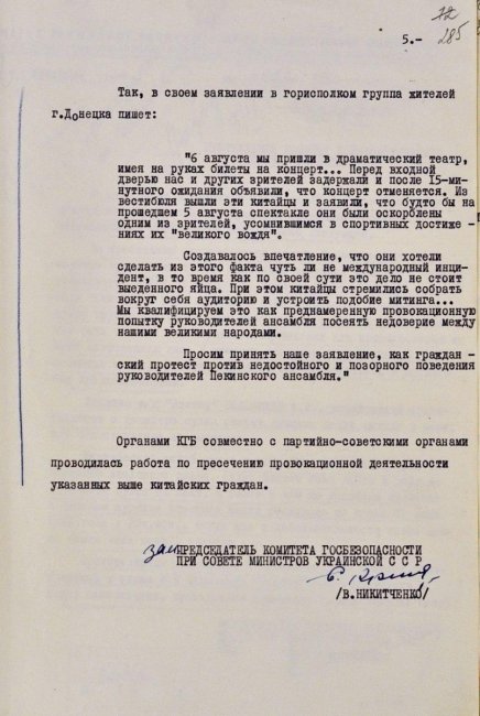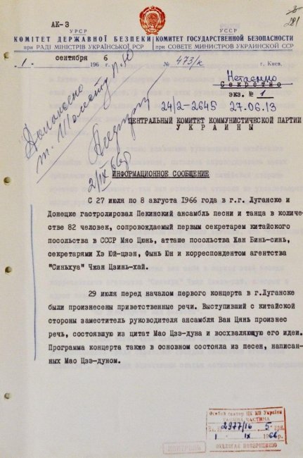 На этом фоне и проходил визит Пекинского ансамбля песни и танца в Донецк в августе 1966 года. Из рассекреченного информационного сообщения Председателя комитета госбезопасности при совете министров УССР В. Никитченко в ЦК компартии Украины мы узнаем подробности пребывания китайцев в Донецке.