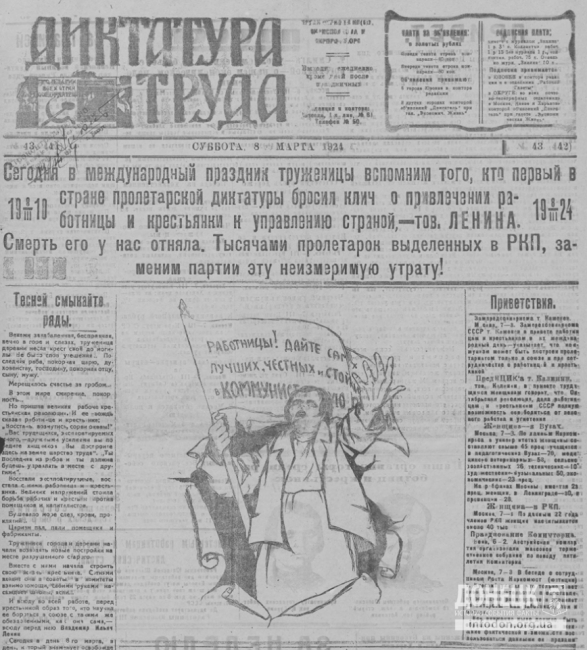 Первая полоса газеты Диктатура труда, 8 марта 1924 г.