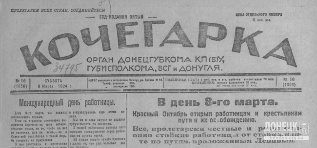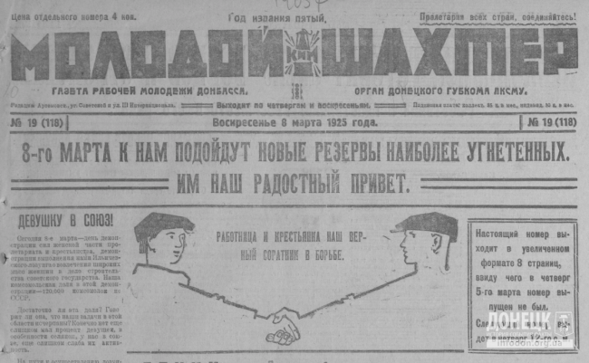 Первая полоса газеты Молодой шахтер, 8 марта 1924 г.