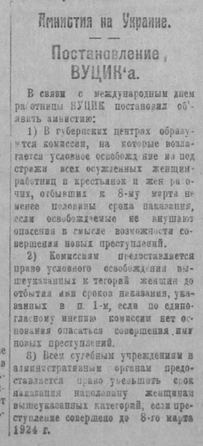В качестве подарка к 8 марта 1924 года в УССР объявили амнистию для женщин, отбывших к 8-му марта не менее половины срока наказания. Правда, попали под нее не все, а лишь идейно «правильные» слои: женщины-работницы и крестьянки и жены рабочих. В своем постановлении ВУЦиК (Всеукраинский центральный исполнительный комитет — высший законодательный, распорядительный, исполнительный и контролирующий орган государственной власти УССР в период между Всеукраинскими съездами советов рабочих, крестьянских и красноармейских депутатов) даже называет 8 марта как «международный день работницы».