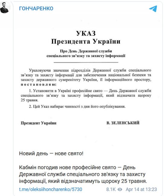 Шестой президент Украины Владимир Зеленский учредил очередной праздник — День Государственной службы специальной связи и защиты информации. Кабинет министров Украины уже согласовал указ президента об установлении нового профессионального праздника — Дня Госспецсвязи. Отмечаться он будет ежегодно 25 мая.